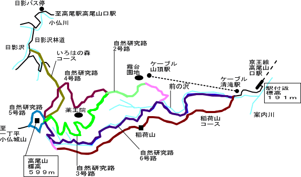 ら高尾山頂までは、尾根を通るコース、谷を通るコース、中腹